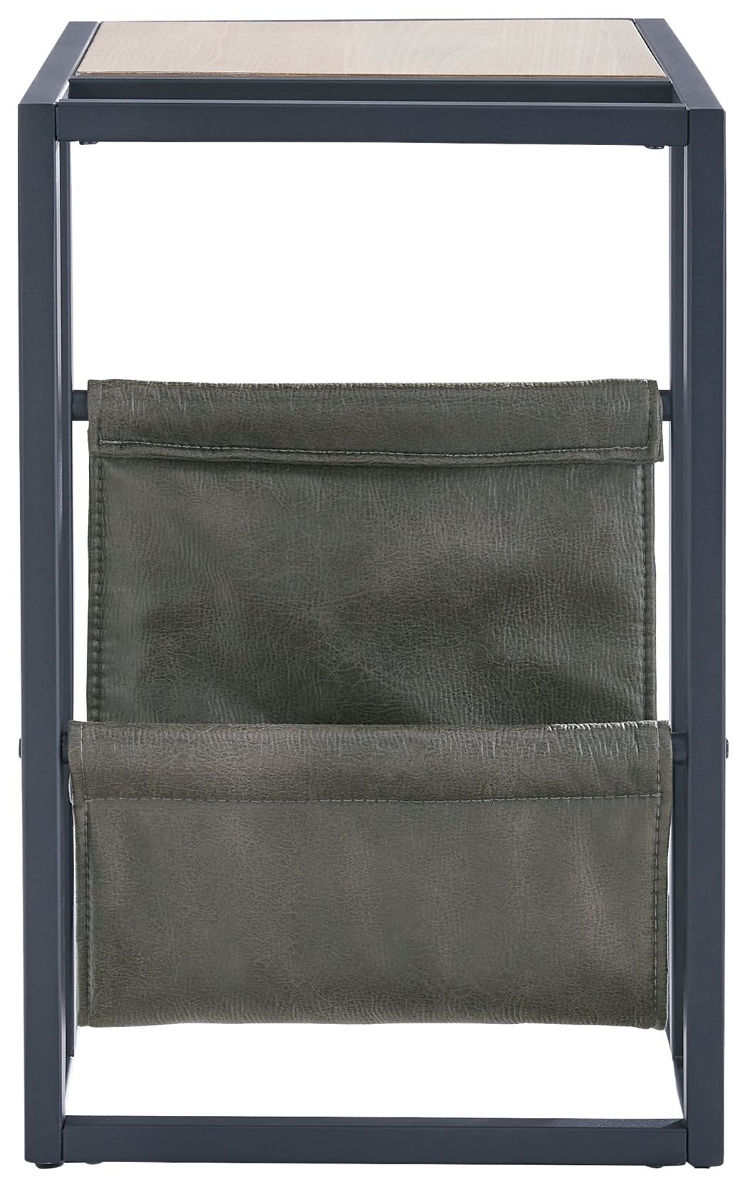 Casual contemporary design with a clean silhouette. That's the beauty of this chairside end table. Quality crafted with elm veneer, its tabletop is finished in a light natural wood tone that lends a fresh, organic look. Cool metal C-frame in a matte black finish and a hanging magazine basket made with a durable brown faux leather coordinate beautifully with the less-is-more profile.